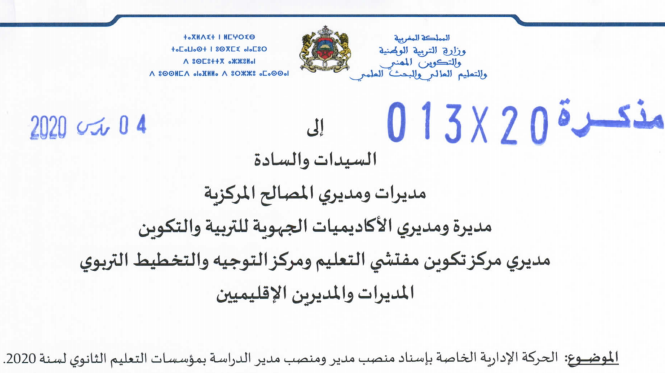مذكرة 013x20 الحركة الادارية الخاصة بإسناد منصب مدير ومصب مدير الدراسة بمؤسسات التعليم الثانوي لسنة 2020 الوظيفة بالمغرب